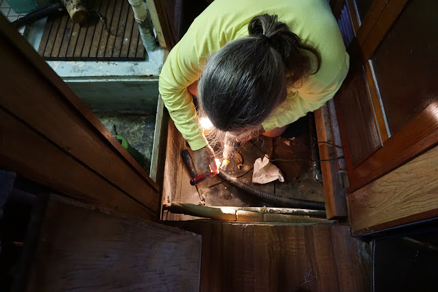 Carter has wanted to be zero discharge for a long time and has now started the process with the installation of a pump in a bucket installed under the sink. He then piped the sinks into the bucket which then pumps out to the water line going up to the french drain on the property which he set up for the shower sump water. It works great. But, when we are cruising, the water will be directed to drain into the black water tank to be pumped out at a proper pump out station. That project has not been started yet but it will be pretty cool to not be contributing to the pollution in this canal.